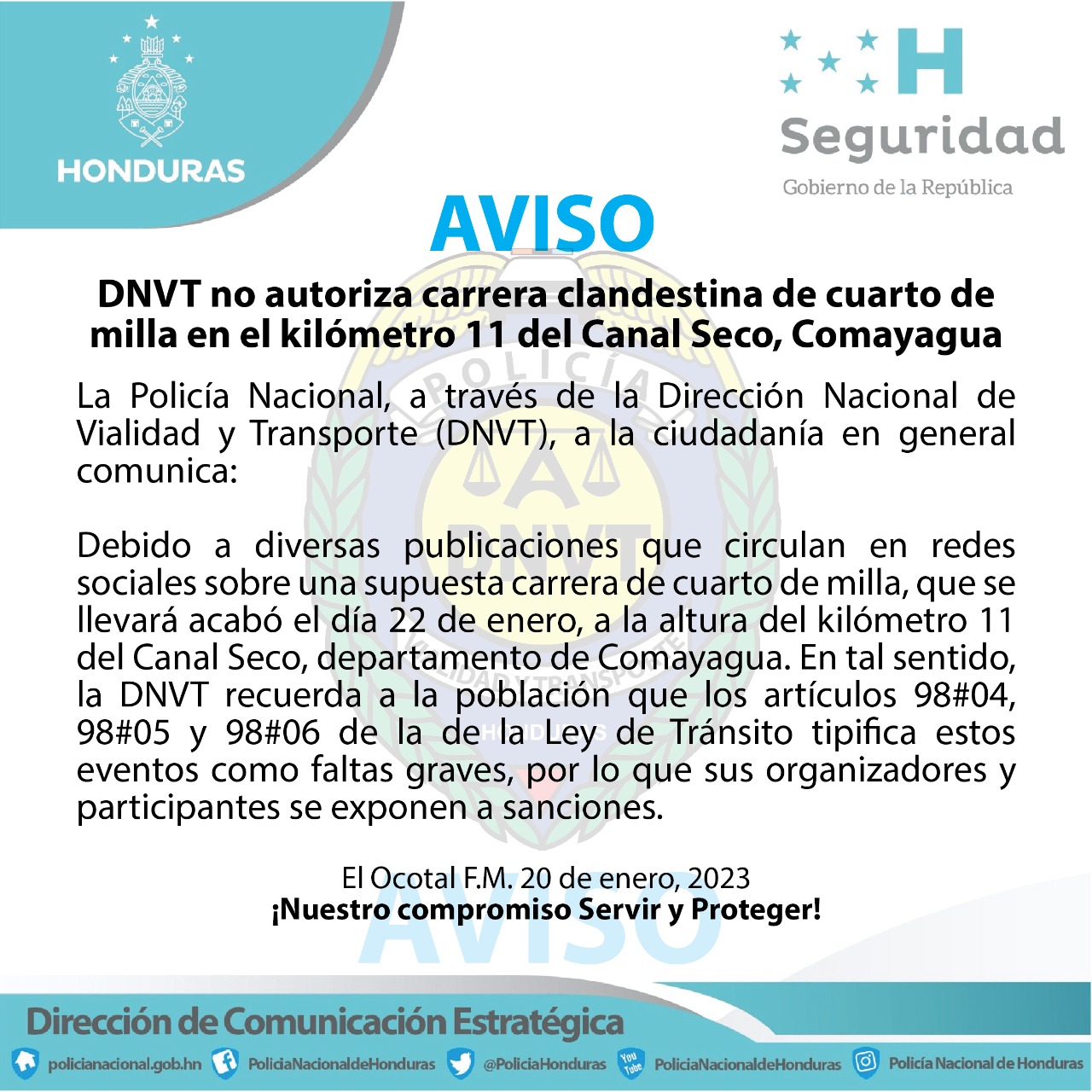 Nacionales Dirección de Vialidad y Transporte desautorizan carreras clandestinas 20 de enero de 2023 Por Redacción Director Nacional de Vialidad y Transporte (DNVT), Comisionado de Policía Roger Alberto Maradiaga Borjas, confirmo que desautorizan carreras clandestinas. Related Topics:Policía Nacional Up Next UMAPS anuncia cambios en la distribución de agua potable No te lo puedes perder... Veedores internacionales para el proceso de selección a magistrados de la CSJ Continuar Leyendo