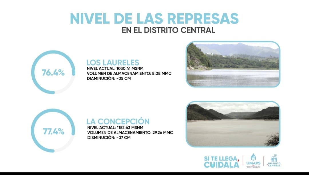 En cambio la represa los Laureles mantiene una capacidad del 76.9%, lo que permite que de momento se otorgue un servicio regular del vital liquido en colonias de Tegucigalpa y Comayagüela.