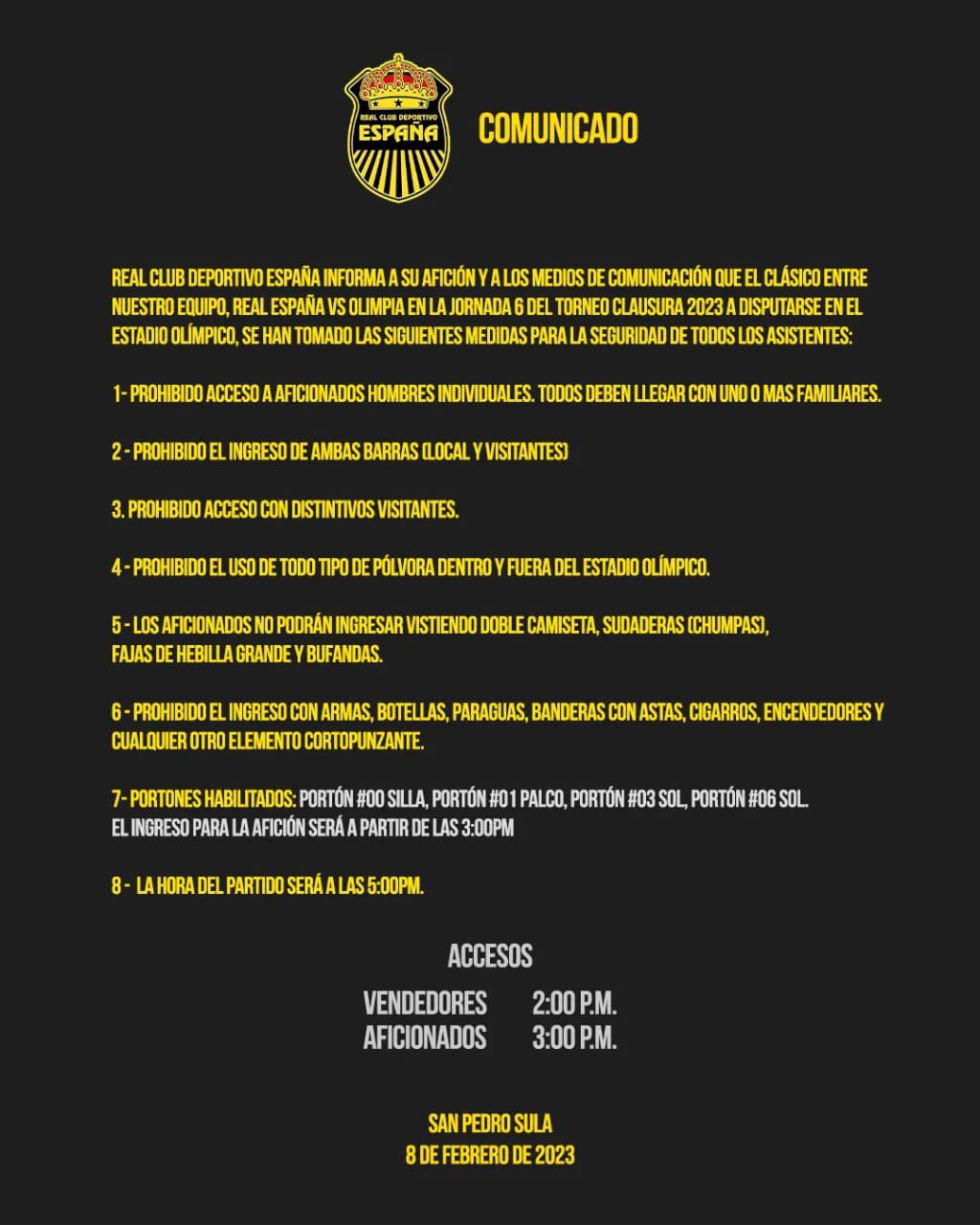 La dirigencia del Real España, en reunión con la Policía Nacional determinaron vetar a las barras organizadas, para evitar que el espectáculo sea empañado por la violencia de alguno de los integrantes de estas agrupaciones.