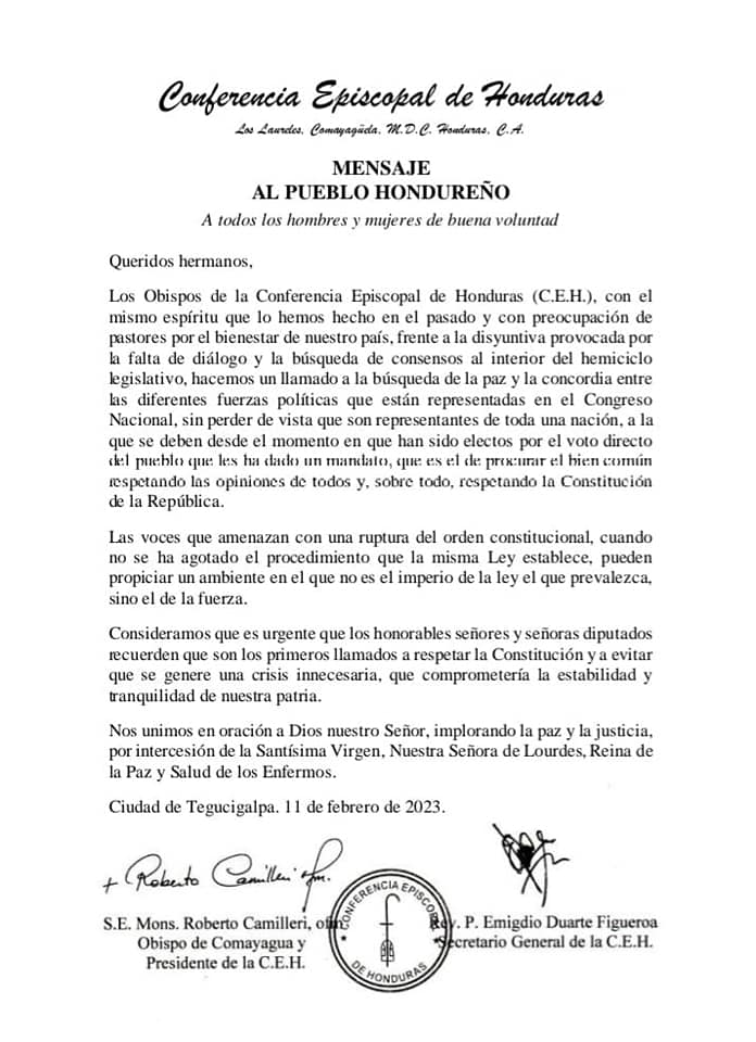 La Conferencia Episcopal de Honduras (CEH) en conferencia de prensa pidió a los 128 diputados del Parlamento hondureño a «respetar la Constitución» y evitar una «crisis innecesaria» en el marco de la elección de los quince nuevos magistrados de la Corte Suprema de Justicia (CSJ).