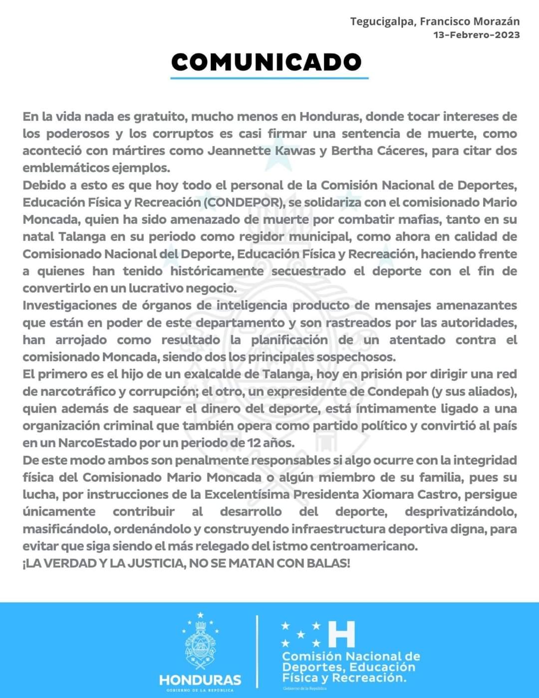 Y agrega, “De este modo ambos son penalmente responsables si algo ocurre con la integridad física del comisionado, Mario Moncada o algún miembro de su familia, pues su lucha por instrucciones de la Presidenta Xiomara Castro, persigue únicamente contribuir al desarrollo del deporte, desprivatizándolo, masificándolo, ordenándolo y construyendo infraestructura digna, para evitar que siga siendo el más relegado del istmo centroamericano”.