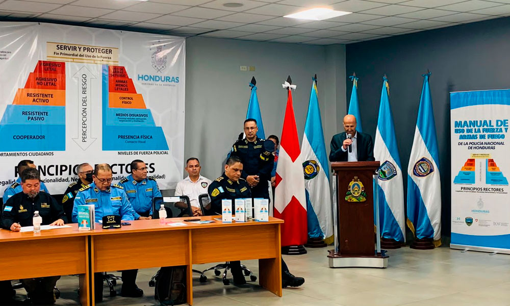 La Secretaría de Seguridad a través de la Policía Nacional en alianza con el Comité para la Defensa de Derechos Humanos (CODEH), Agencia Suiza para el Desarrollo y la Cooperación (COSUDE) y el Centro de Ginebra para la Gobernanza del Sector Seguridad (DCAF) presentaron el Acuerdo 0441-2023, llamado “Manual Uso de la Fuerza y Armas de Fuego”.