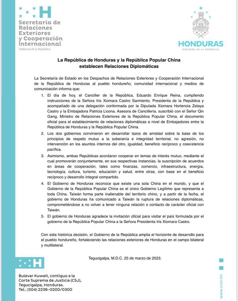 Los ministros de Exteriores de Honduras, Eduardo Reina, y China, Qin Gang, firmaron en Pekín un «Comunicado Conjunto sobre el Establecimiento de Relaciones entre la República Popular China y la República de Honduras» que oficializa los nexos entre las dos naciones.