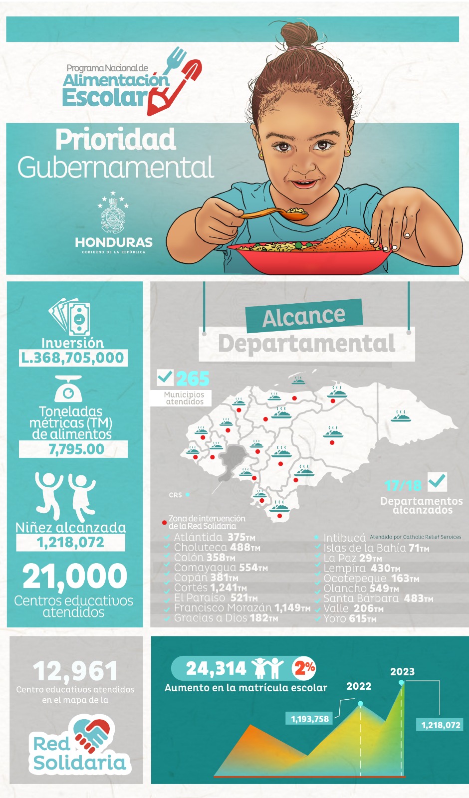 El Gobierno de República a través de la Secretaría de Desarrollo Social (SEDESOL) realizó la entrega de siete mil setecientas noventa y cinco (7,795) toneladas métricas de alimentos y granos básicos, a más de 21 mil centros Educativos Gubernamentales Públicos que atienden una matrícula de un millón doscientos dieciocho mil setenta y dos (1,218,072) niños y niñas, esta primera entrega representa una inversión para el Estado de trecientos sesenta y ocho millones setecientos cinco mil lempiras (L368,705,000.00).