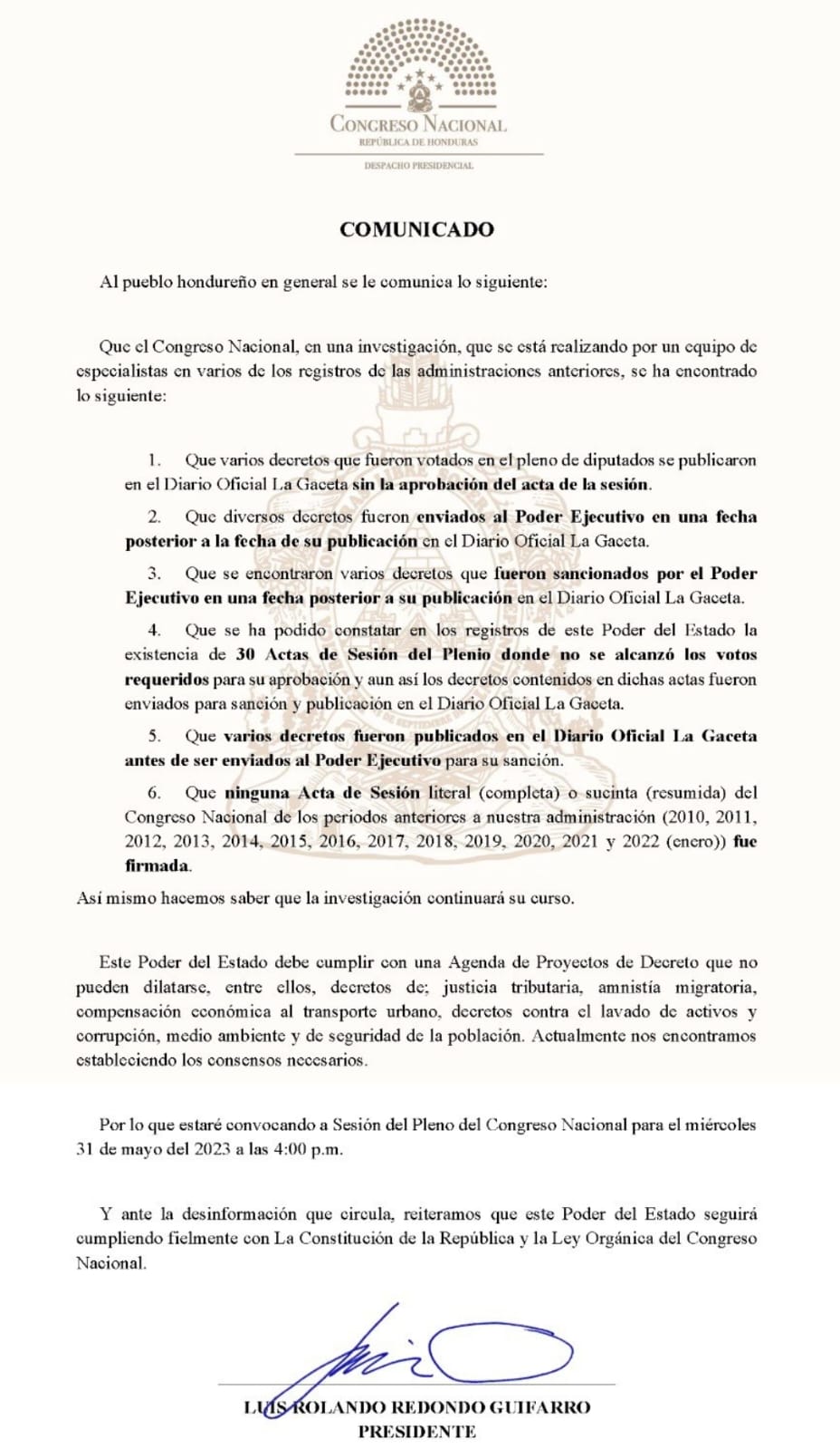 El comunicado leído por el titular del Congreso Nacional, Luis Redondo, denunció que varios decretos de períodos anteriores fueron votados en el pleno de diputados se publicaron en el Diario Oficial La Gaceta sin la aprobación del acta de la sesión.
