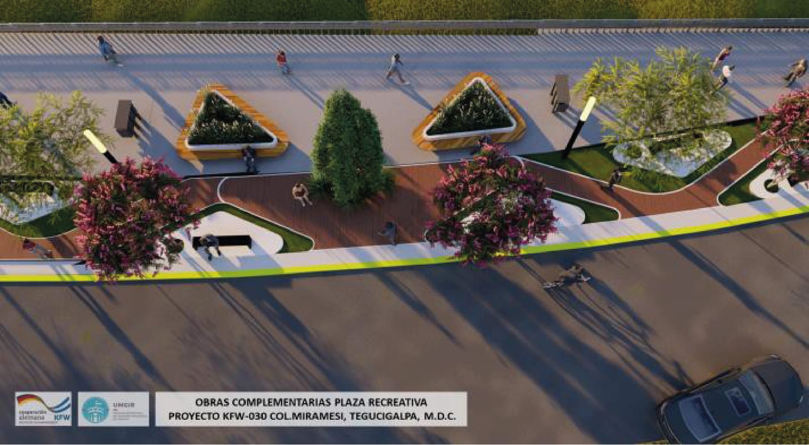 en el área recreativa, una plaza de acceso y un paso vehicular hacia el bulevar Morazán.