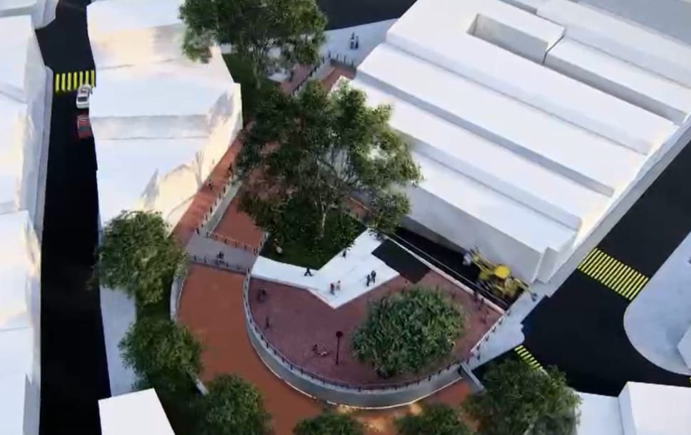 de la plaza La Orejona, una rampa vehicular para mantenimiento, un puente peatonal