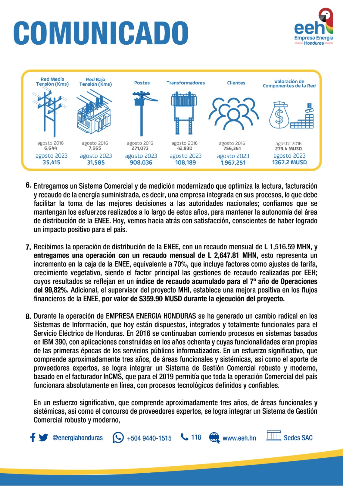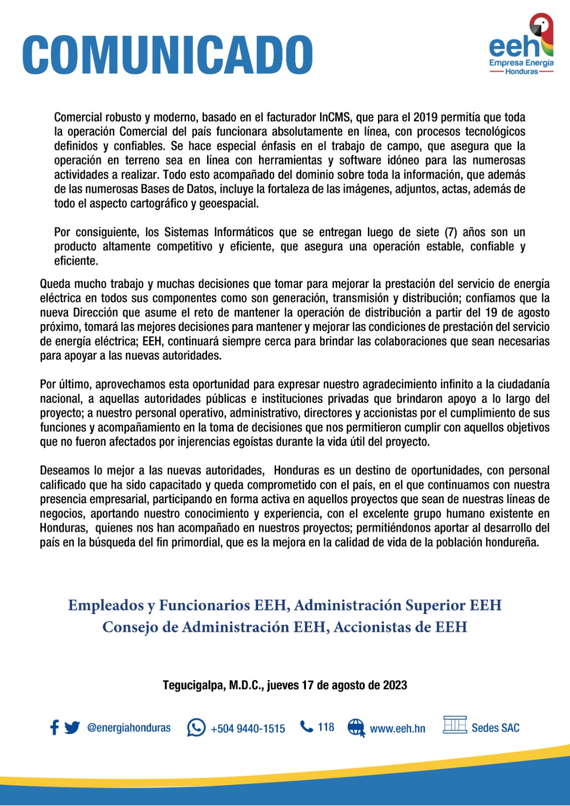 La EEH indicó en un extenso comunicado que ha llegado «al final de un camino» trazado de forma conjunta entre el Estado de Honduras y el Banco Ficohsa, el 18 de febrero de 2016, fecha en la que se suscribió un contrato de Alianza Público-Privada, cuya vigencia termina este viernes, anuncio que confirmo a través de un comunicado publico.
