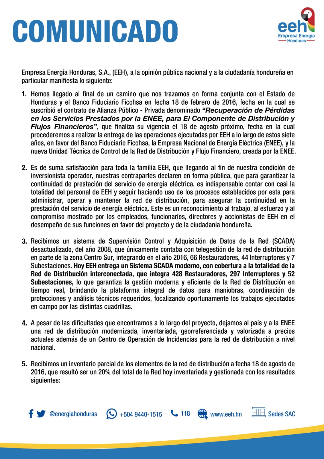 La Empresa Energía Honduras (EEH), de capital colombiano, anunció este jueves que este viernes concluirá su contrato en el país centroamericano y comenzará a entregar las operaciones a la estatal Empresa Nacional de Energía Eléctrica (ENEE) , a la que deja una «distribución modernizada».