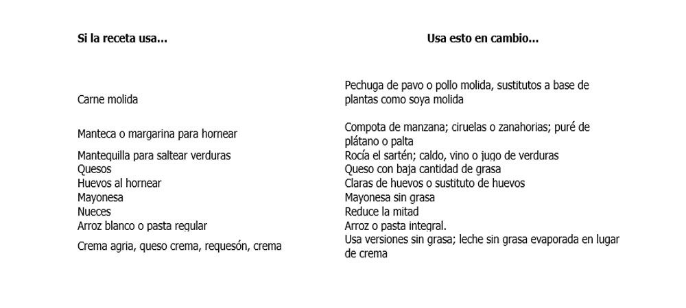 Susan Bowerman nos comparte a continuación una útil tabla con intercambios de ingredientes comunes que pueden ayudarnos a aligerar nuestras recetas favoritas: