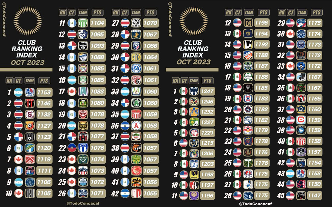 A nivel general el ranking es liderado por los equipos mexicanos como Monterrey, América, Tigres, León, Toluca, Filadelphia Unión (MLS), Chivas, Pachuca y Nashville (MLS).