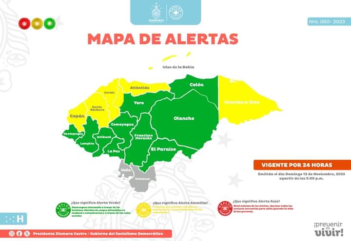 Por saturación de suelos, niveles altos de los ríos, constantes lluvias, y daños, la Secretaría de Estado en los Despachos de Gestión de Riesgos y Contingencias Nacionales, extiende la alerta amarilla a los departamentos de Islas de la Bahía, Atlántida, Cortés, Santa Bárbara y Copán y suma a este nivel de alertamiento al departamento de Gracias a Dios, por un período de 24 horas más a partir de las 5 p.m. de hoy domingo 12 de noviembre 2023.