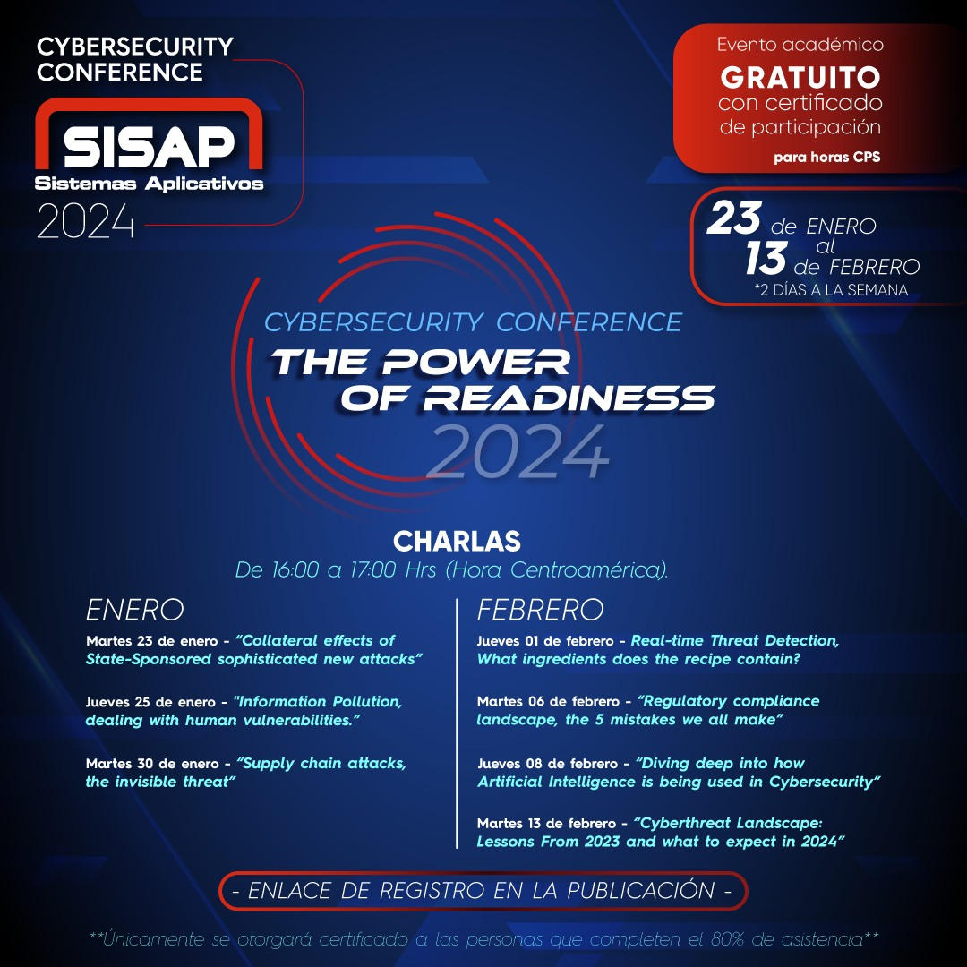 Sistemas Aplicativos (SISAP), presenta la tercera edición del Cybersecurity Conference 2024, programa que ofrece conferencias virtuales a profesionales de la ciberseguridad y tecnología de la información, de forma gratuita.