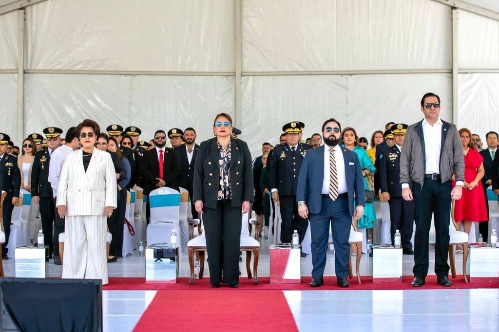La Presidenta de la República, Iris Xiomara Castro, junto a los titulares del Congreso Nacional, Luis Redondo y del Poder Judicial, Rebeca Ráquel, participó en el magno evento celebrado en la sede del Instituto Técnico Policial en la ciudad de La Paz.