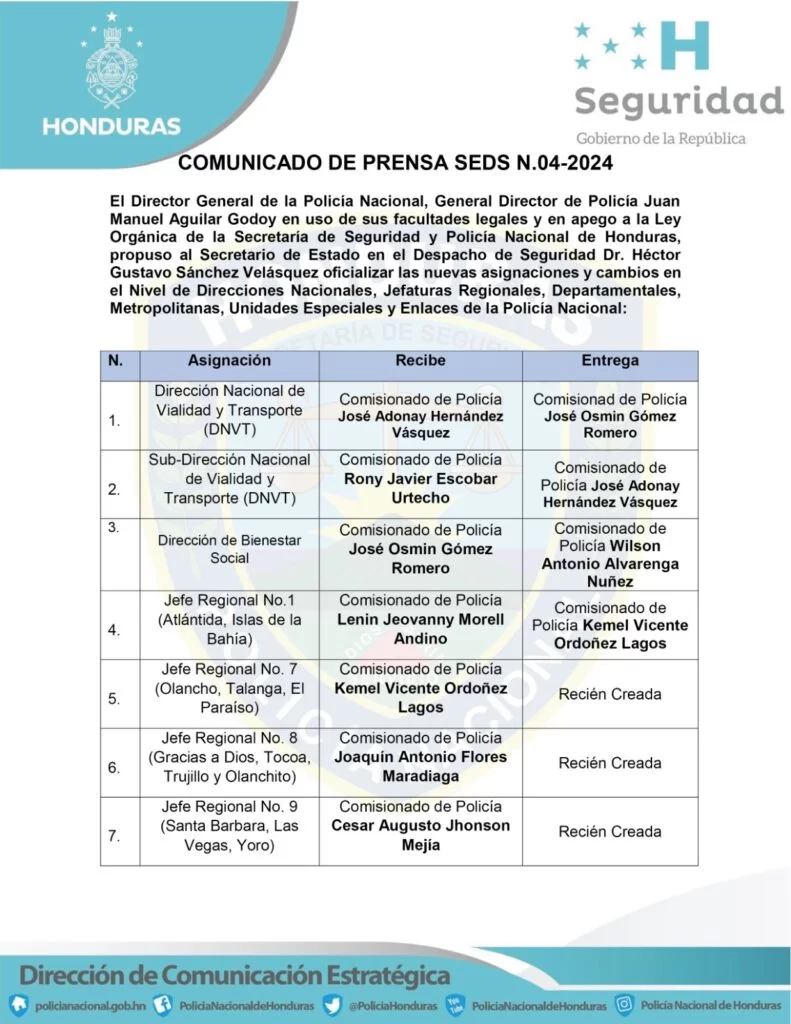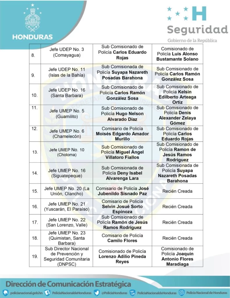 La Secretaría de Seguridad oficializó este sábado al menos 28 cambios es la estructura operacional de la Policía Nacional.