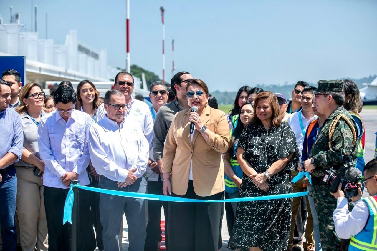 La presidenta Xiomara Castro inauguró hoy el proyecto de transformación del Aeropuerto Internacional “Golosón” de La Ceiba que es parte del plan de modernización que incluye también el “Ramón Villeda Morales”, de San Pedro Sula y el “Juan Manuel Gálvez”, de Roatán.