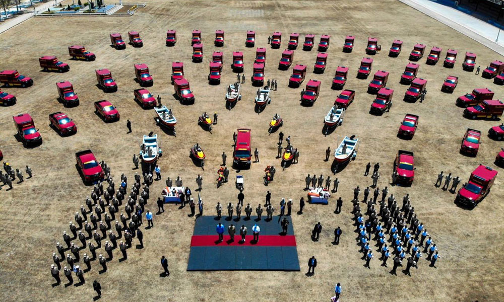 Se trata de 55 ambulancias, 18 vehículos doble cabina, nueve motocicletas- entre la cuales hay motos acuáticas- lanchas, equipo de respiración, mangueras, trocos, aparatos de asistencia para primeros auxilios, sistema de comunicaciones, uniformes y equipo contra incendios, entre otros.