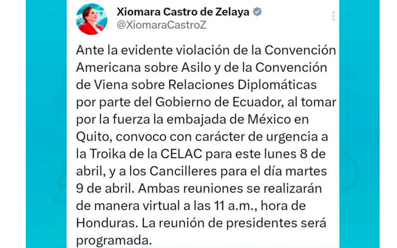 La presidenta Pro Tempore del Comunidad de Estados Latinoamericanos y Caribeños (CELAC), Xiomara Castro convocó a la Troika para abordar la violación de la Convención Americana sobre Asilo y de la Convención de Viena sobre Relaciones Diplomáticas por parte del Gobierno de Ecuador, que la noche del viernes sacó de la embajada de México en Quito al expresidente Jorge Glas.