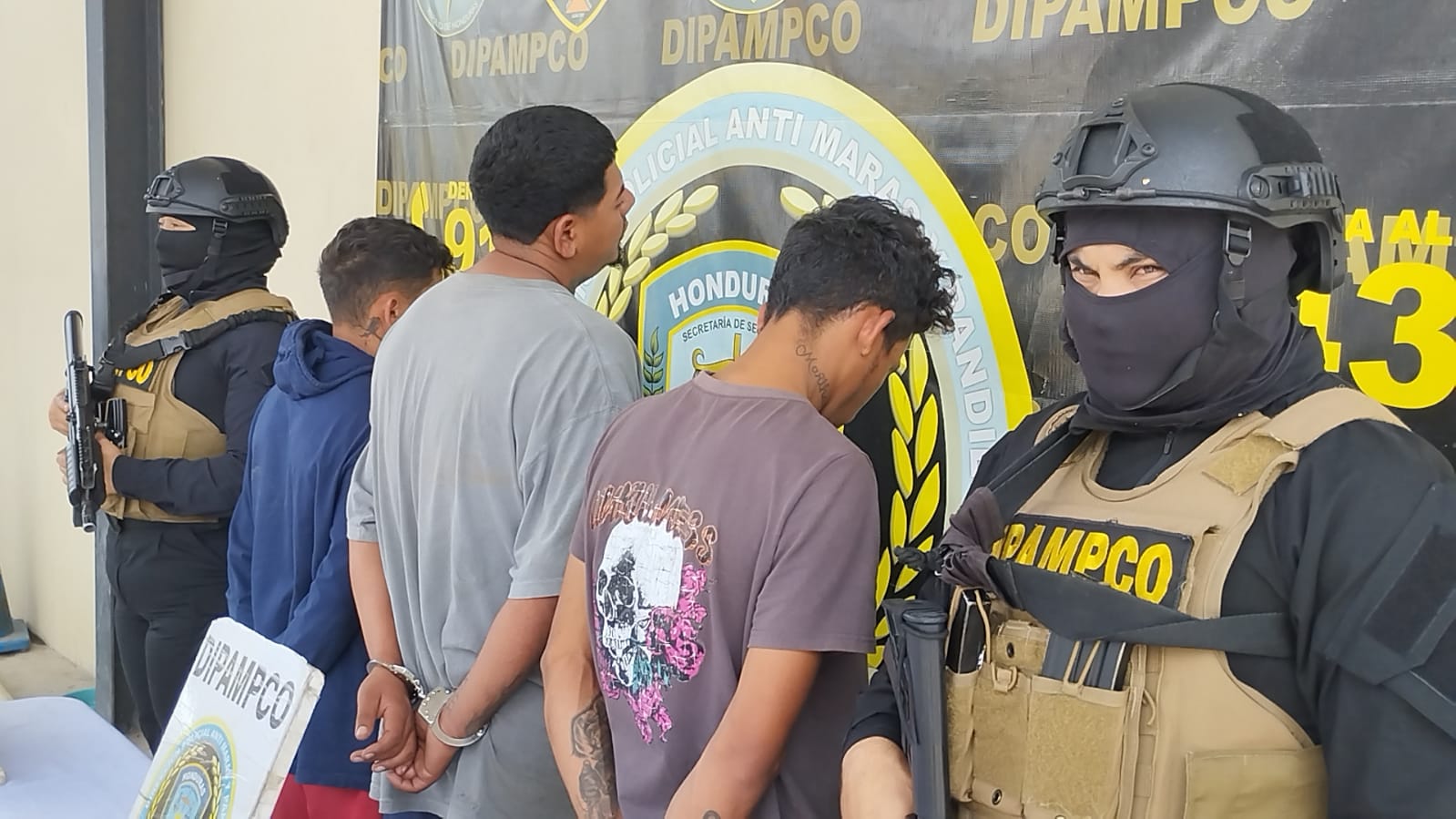 Producto de estas operaciones, hace unos instantes en el municipio de Guaimaca en el departamento de Francisco Morazán, equipos especiales de la DIPAMPCO capturaron a tres miembros de la Pandilla 18 relacionados con estructuras de sicariato, venta de drogas y reclutamiento forzado.
