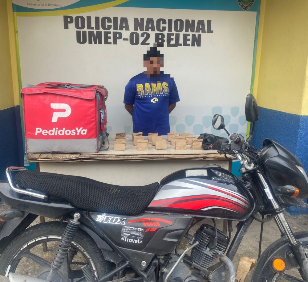 Es importante mencionar que la acción policial fue ejecutada en colonia Villa Adela de Comayagüela, mediante seguimiento, los uniformados solicitaron un registro personal al ciudadano se le encontró en posesión de quince paquetes de papel café conteniendo en su interior hierba seca supuesta Marihuana dentro de una mochila de empresa de Pedidos Ya.
