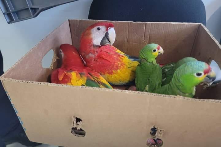 En el decomiso se identificó: dos Guaras Rojas (Ara Macao), dos loras frente roja (Amazona Autunnalis) y una lora corona azul (Amazona Farinosa).