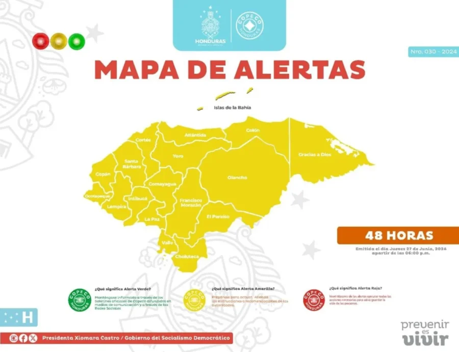 La Secretaría de Estado en los Despachos de Gestión de Riesgos y Contingencias Nacionales (COPECO), determinó dejar en Alerta Amarilla a todo el país, por un período de 48 horas a partir de las 6:00 de la tarde de hoy jueves 27 de junio 2024.