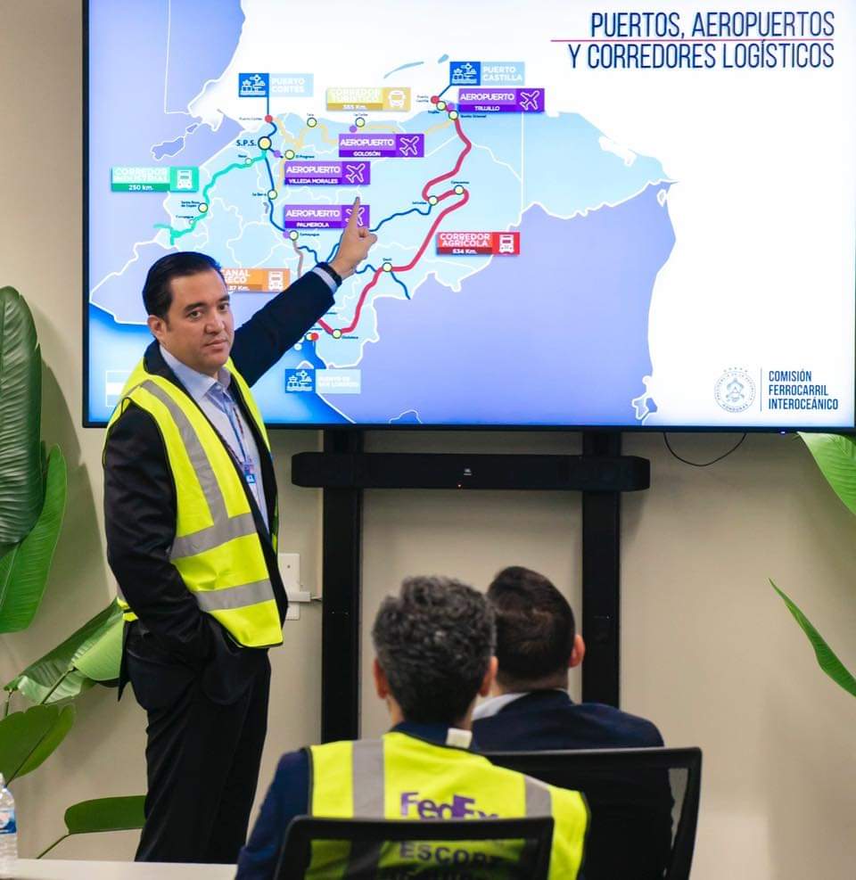 El director ejecutivo de la Comisión Nacional del Ferrocarril Interoceánico CONFI se reunió con ejecutivos de FedEx en la rampa de la compañía en el Aeropuerto de Miami, donde presentó el proyecto del Ferrocarril Interoceánico como un sistema logístico con sede en Honduras.
