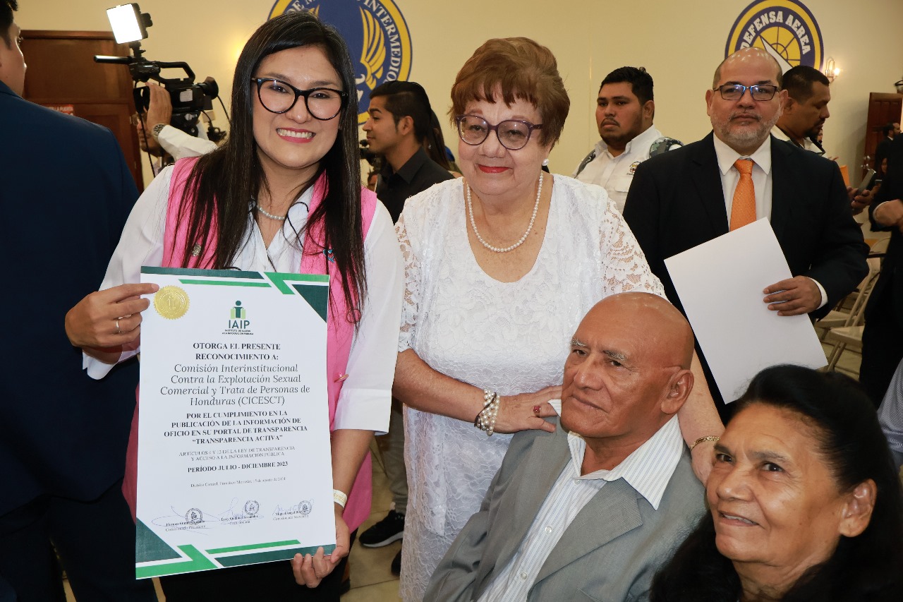 Por tercer año consecutivo, la Comisión Interinstitucional contra la Explotación Sexual Comercial y Trata de Personas (CICESCT) recibe el pergamino de transparencia otorgado por el Pleno de Comisionados del Instituto de Acceso a la Información Pública (IAIP), por haber logrado el 100 por ciento del puntaje por el cumplimiento de la transparencia activa.