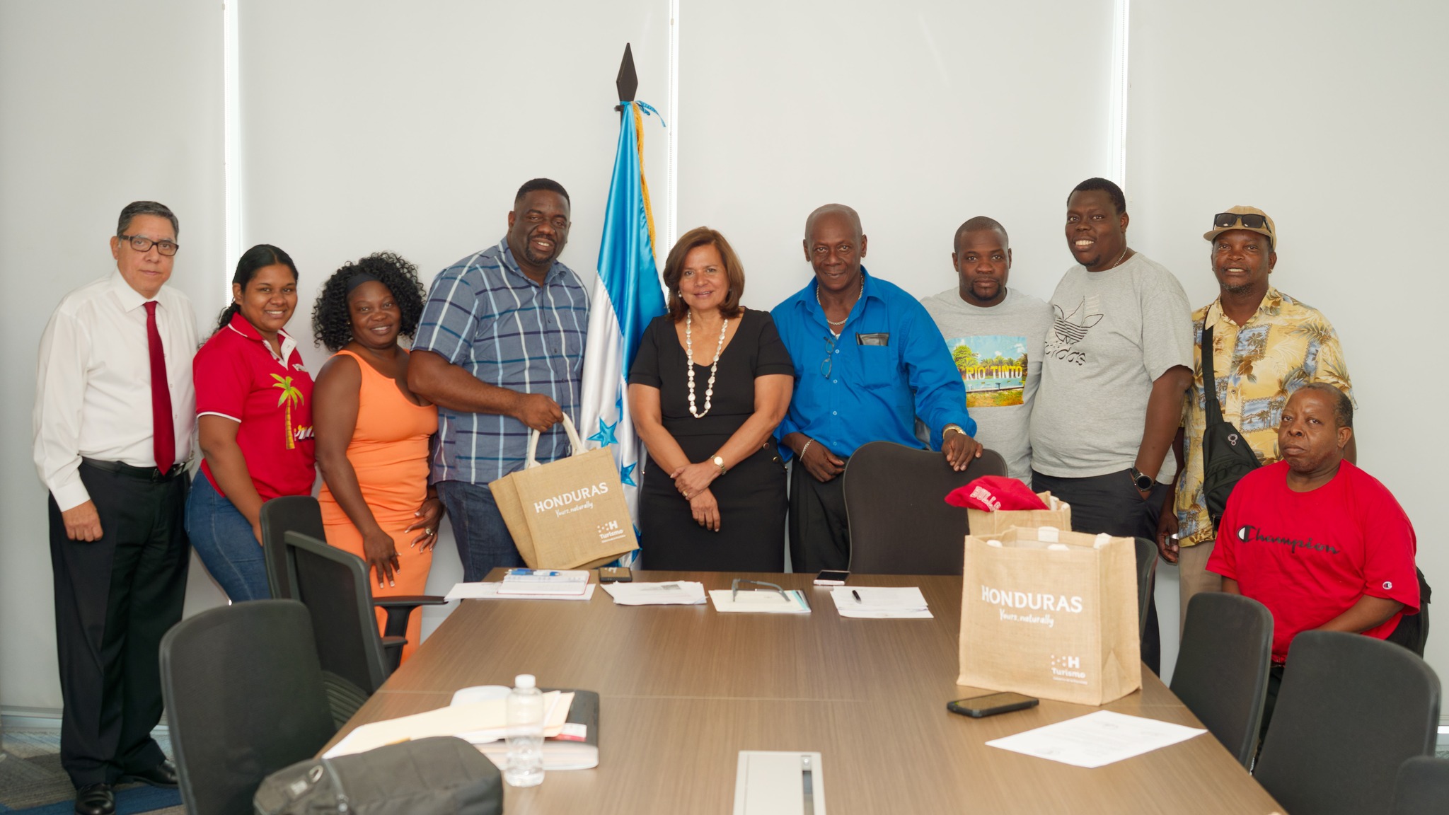 La ministra de Turismo, Yadira Gómez en compañía del secretario general, Mario Nuila y la coordinadora de desarrollo de la Organización de Gestión de Destinos (OGD), Maribel Espinoza sostuvieron esta mañana una reunión con miembros representantes de la Federación de Patronatos Garífunas de Bahía de Tela, donde se abordó varios temas de interés para las comunidades de lugar.
