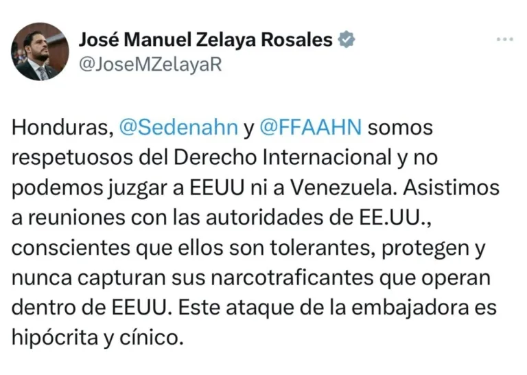 «Honduras, @Sedenahn y @FFAAHN somos respetuosos del Derecho Internacional y no podemos juzgar a EEUU ni a Venezuela. Asistimos a reuniones con las autoridades de EE.UU., conscientes que ellos son tolerantes, protegen y nunca capturan sus narcotraficantes que operan dentro de EEUU. Este ataque de la embajadora es hipócrita y cínico», publicó Zelaya en sus redes.
