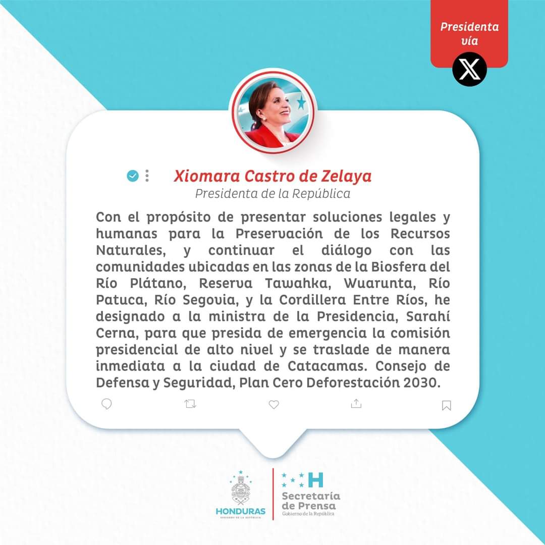 Con el propósito de presentar soluciones legales y humanas para la preservación de los recursos naturales, y continuar el diálogo con las comunidades ubicadas en las zonas de la Biosfera del Río Plátano, Reserva Tawahka, Wuarunta, Río Patuca, Río Segovia, y la Cordillera Entre Ríos; la presidenta Xiomara Castro designó a la Ministra de la Presidencia, Sarahí Cerna para dar respuesta inmediata.