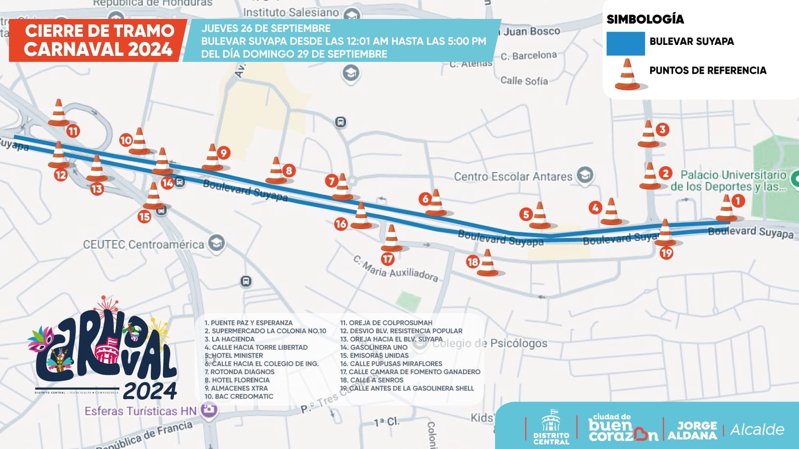 A partir de la 1:00 AM de este jueves y hasta el domingo a las 5:00 PM permanecerán cerrados 1.7 kilómetros del bulevar Suyapa para el montaje y desmontaje de escenario que darán vida al carnaval de la capital. El cierre de tramo comprende desde la agencia principal de Davivienda hasta la entrada del Polideportivo de la Universidad Nacional Autónoma de Honduras (UNAH).
