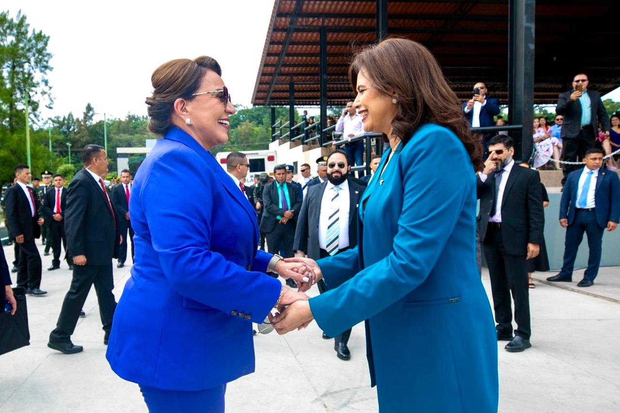 El presidente del Congreso Nacional, Luis Redondo junto a la presidenta de la Corte Suprema de Justicia, Rebeca Obando y la secretaria de SEDENA, Rixi Moncada acompañaron este sábado a la presidenta de la Republica, Xiomara Castro a la ceremonia de ascenso de nueve coroneles al grado de generales de brigada de las Fuerzas Armadas en el Campo de Parada Marte.