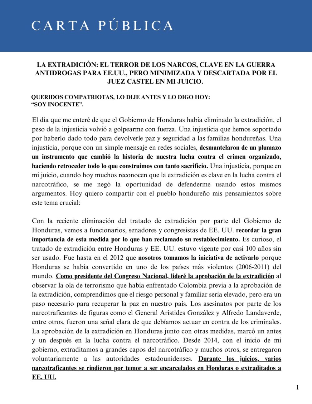 En una carta divulgada en las redes sociales por su esposa, Ana García, Hernández indicó que es una «injusticia» que Honduras haya dado por terminado el tratado de extradición con EE.UU. después de que su Gobierno hizo «todo para devolverle paz y seguridad» a los hondureños.