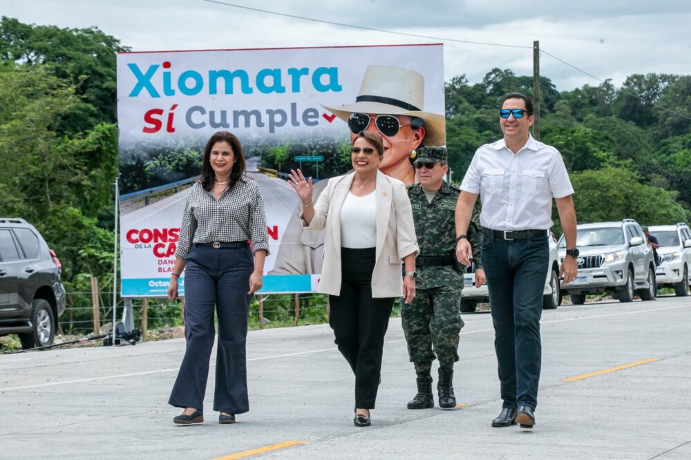 La presidenta de Honduras, Xiomara Castro, acompañada por el secretario privado de la Presidencia, Héctor Zelaya y el titular de la Secretaría de Infraestructura y Transporte (SIT), Octavio Pineda, inauguraron la pavimentación de la carretera Las Lomas, Danlí, El ParaísoTerrero Blanco, Patuca en Olancho.