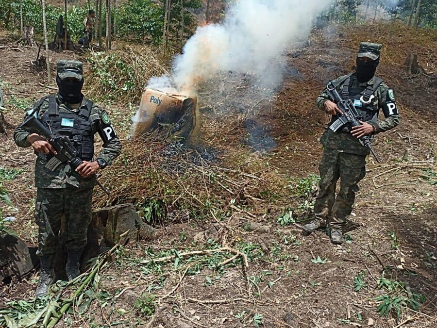 Las Fuerzas Armadas de Honduras a través de la Policía Militar del Orden Público mediante operaciones de inteligencia, en el sector Aldeas las Marías, Juan Francisco Bulnes, Gracias a Dios de forma reciente llevaron a cabo el proceso de erradicación y destrucción vía incineración de 2 plantaciones de droga tipo arbusto de coca.