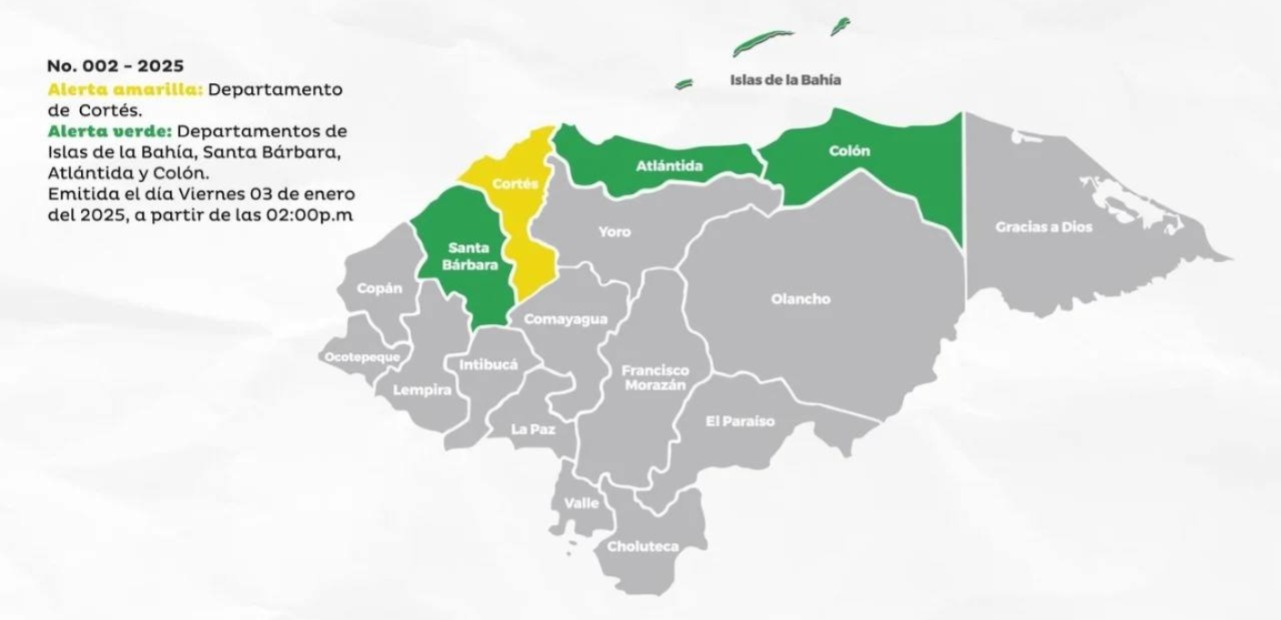 La Secretaría de Estado en los Despachos de Gestión de Riesgos y Contingencias Nacionales (COPECO) eleva a Alerta Amarilla al departamento de Cortés y mantiene en Alerta Verde a los departamentos de Islas de la Bahía, Santa Bárbara, Atlántida y Colón por un período de 24 horas, a partir de las 2:00 p.m. de hoy, viernes 3 de enero de 2025.