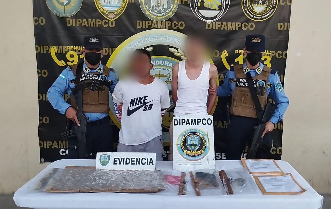 Los dos miembros de esa estructura criminal mara Salvatrucha, serán remitidos a los juzgados capitalinos acusados por el delito de tráfico de drogas en perjuicio de la salud del Estado de Honduras y porte ilegal de arma de fuego de uso permitido.