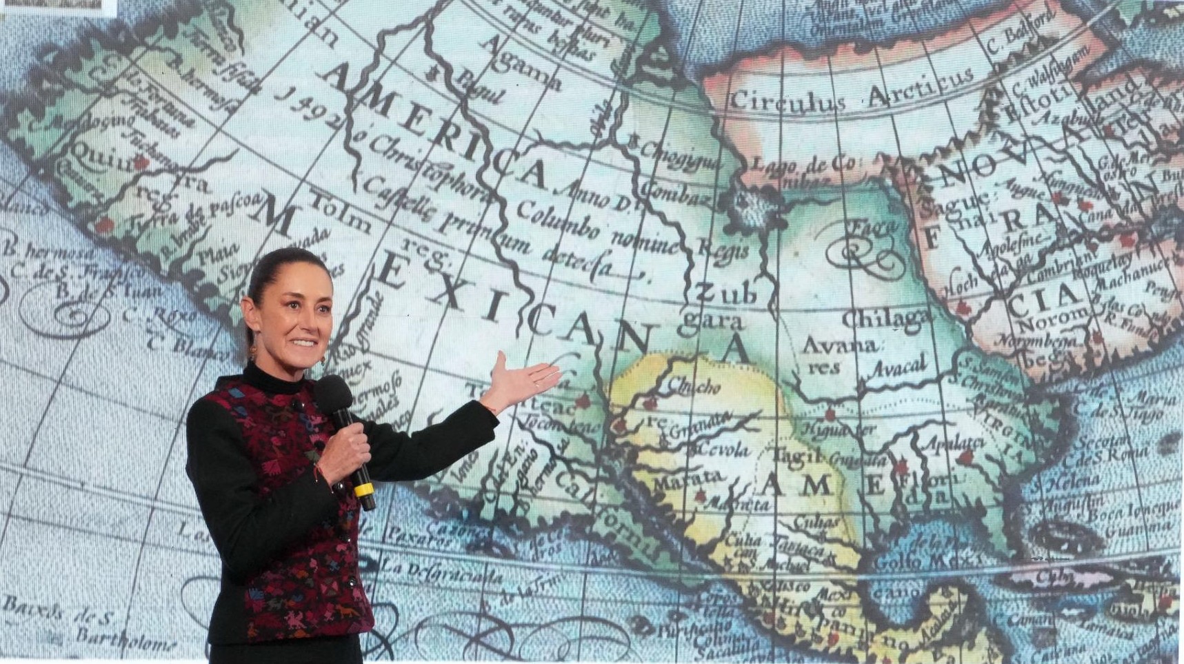 Sonriente y mostrando un mapamundi de 1607 en el que aparece una parte del territorio mexicano y una parte del territorio estadounidense como una sola unidad -sin la separación limítrofe que existe en la actualidad-, Claudia Sheinbaum propuso renombrar esa geografía.