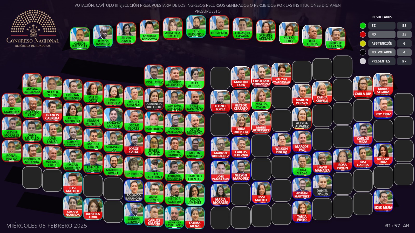 Además, lamentó la inasistencia es lamentable, casi estaba la bancada Libre completa al igual que la del Partido Nacional, la bancada del partido Liberal estaba un poco más de la mitad, por la no aprobación del presupuesto teníamos muchos atrasos en el país.