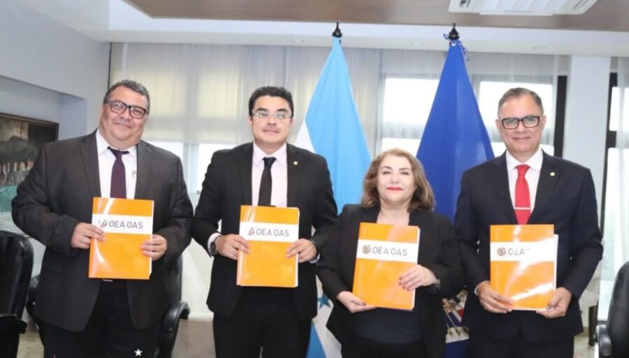 El Vicecanciller de Asuntos Consulares y Migratorios, Antonio García, recibió el documento en representación del Canciller Eduardo Enrique Reina, acompañado por el Vicecanciller de Política Exterior, Gerardo Torres, La Ministra de Asuntos de la Mujer, Doris García, el Subgerente de Recursos Humanos de la SRECI, Oscar Rigamontty, y la Embajadora de la OEA en Honduras, Catherine Pognat.