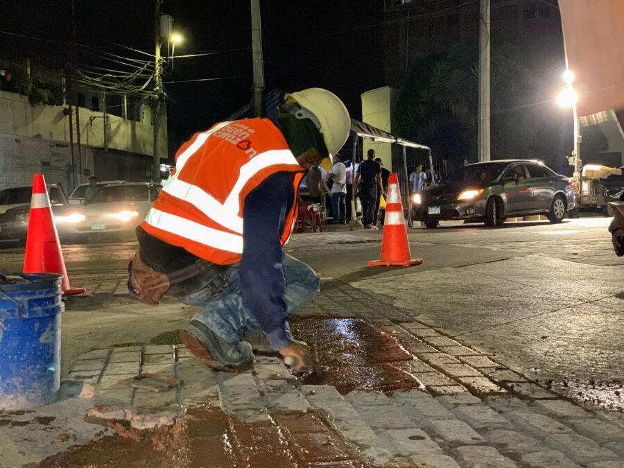 «En horario nocturno, los equipos de la Alcaldía intervienen con trabajos de reparación la avenida Gutenberg, del barrio Guanacaste», informó el alcalde capitalino, Jorge Aldana.