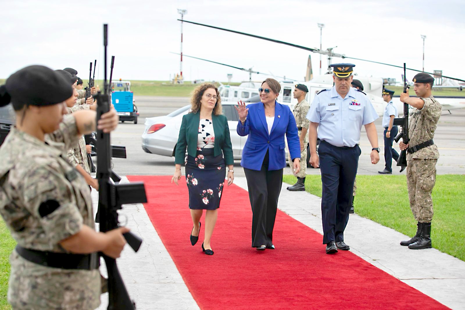 A su arribo a territorio suramericano, la mandataria fue recibida por las autoridades diplomáticas uruguayas y por el vicecanciller de Honduras, Gerardo Torres.