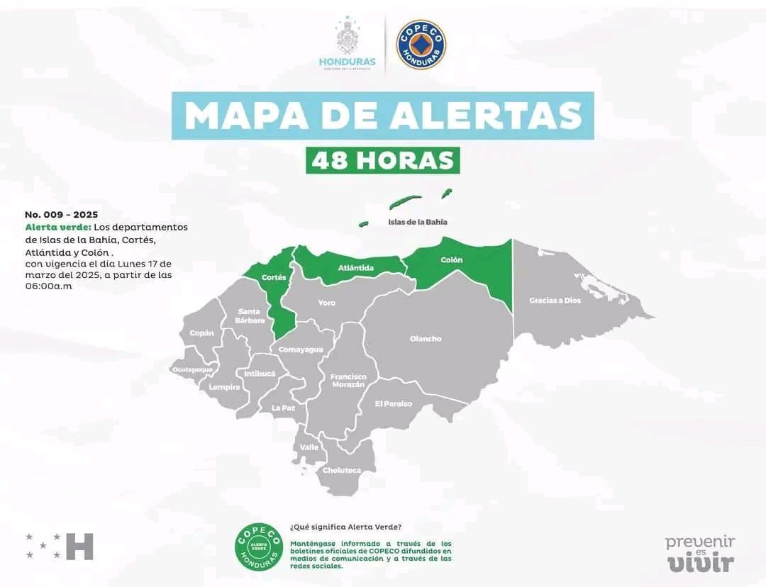 La Secretaría de Estado en los Despachos de Gestión de Riesgos y Contingencias Nacionales (COPECO), declara alerta verde en los departamentos de Cortés, Atlántida, Islas de la Bahía y Colón, por un período de 48 horas a partir de las 6 de la mañana del lues 17 de marzo.