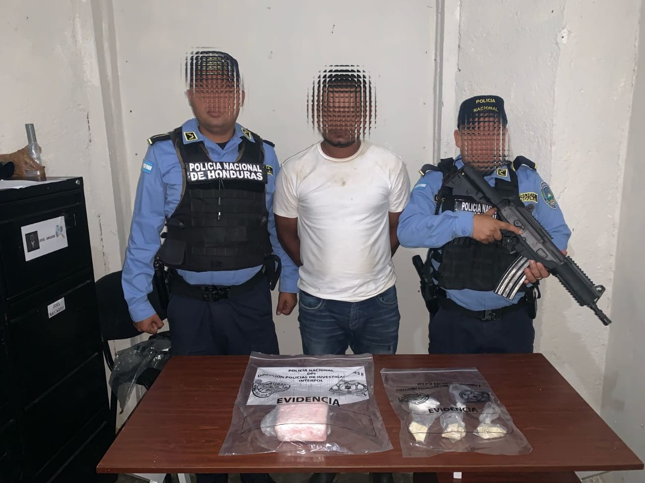 Se trata de un hondureño de 29 años, residente en el municipio donde se realizó su aprehensión, decomisando un paquete plástico conteniendo en su interior aproximadamente un kilo de supuesta Cocaína, así como dos envoltorios más individuales y tres piedras de supuesto Crack.