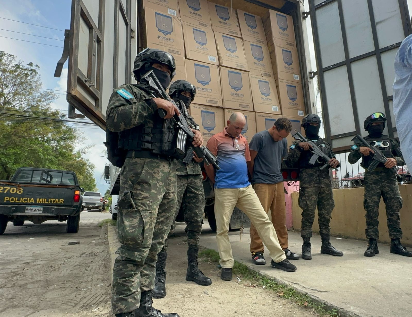 Las Fuerzas Armadas de Honduras a través de la Policía Militar del Orden Público en el marco de la Operación del Plan nacional de Seguridad Solución Contra el Crimen, logró la detención de dos ciudadanos, quienes trasladaban de manera ilegal gran cantidad de cigarrillos marca Modern.