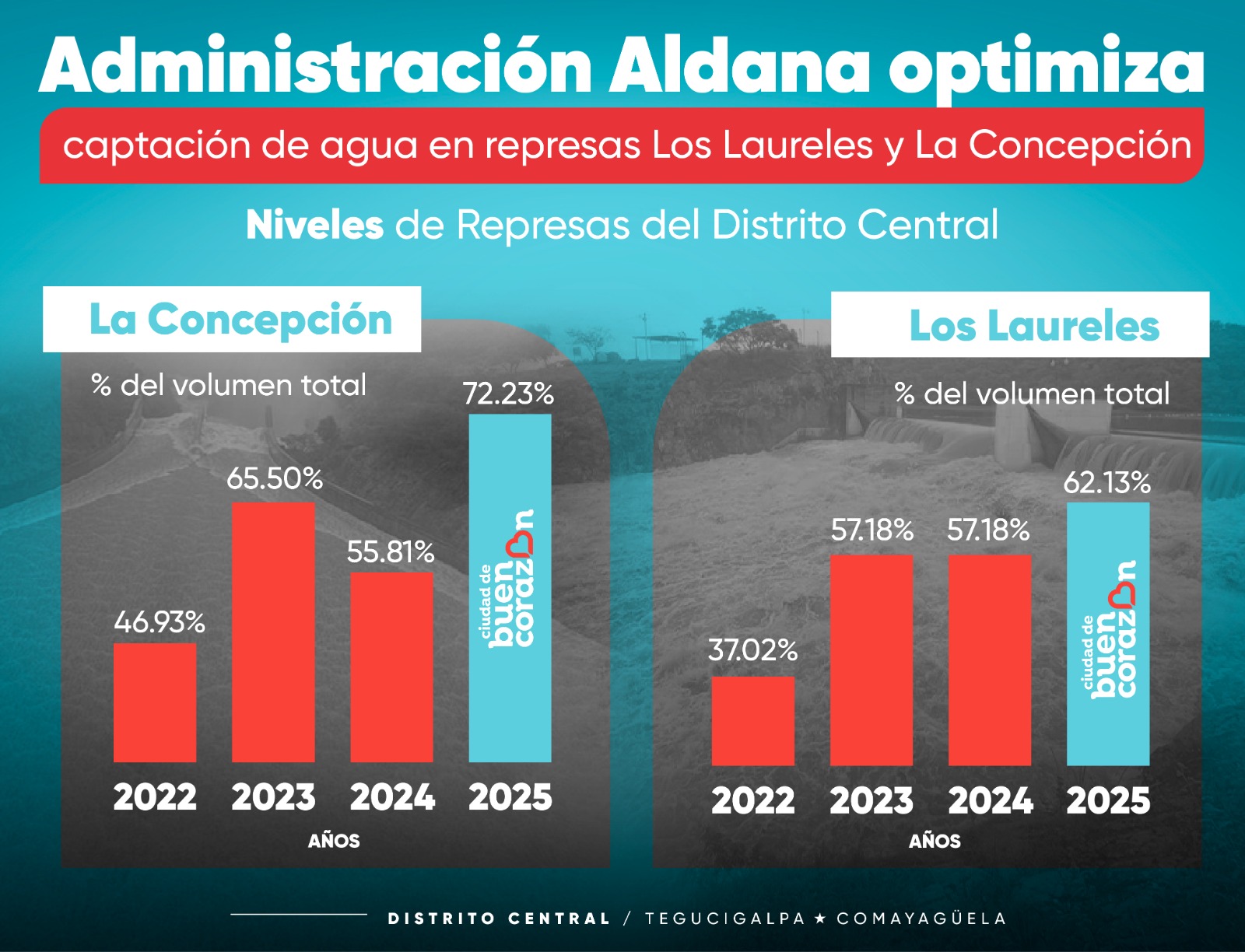 En 2022, en el primer año del edil Aldana, el embalse de La Concepción reportaba un 46.9% de su capacidad total, en los siguientes dos años experimentó crecimientos entre 10 y 20% en su nivel. En la actualidad esta represa se encuentra en un 72% de su capacidad total.