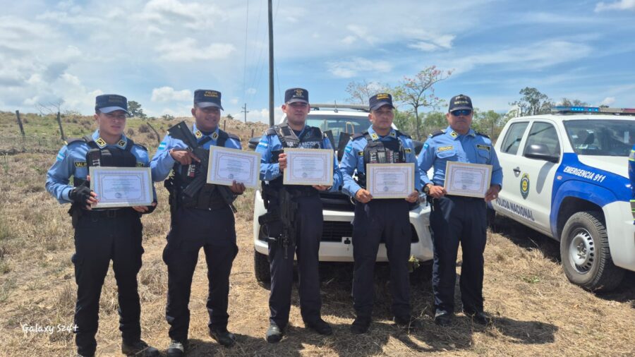 La Secretaría de Estado en el Despacho de Seguridad, a través de la Policía Nacional, otorgó un reconocimiento a cinco funcionarios policiales por su destacada actuación al capturar a cuatro sujetos cuando ejecutaban un robo en una sucursal de una institución financiera en el occidente del país.