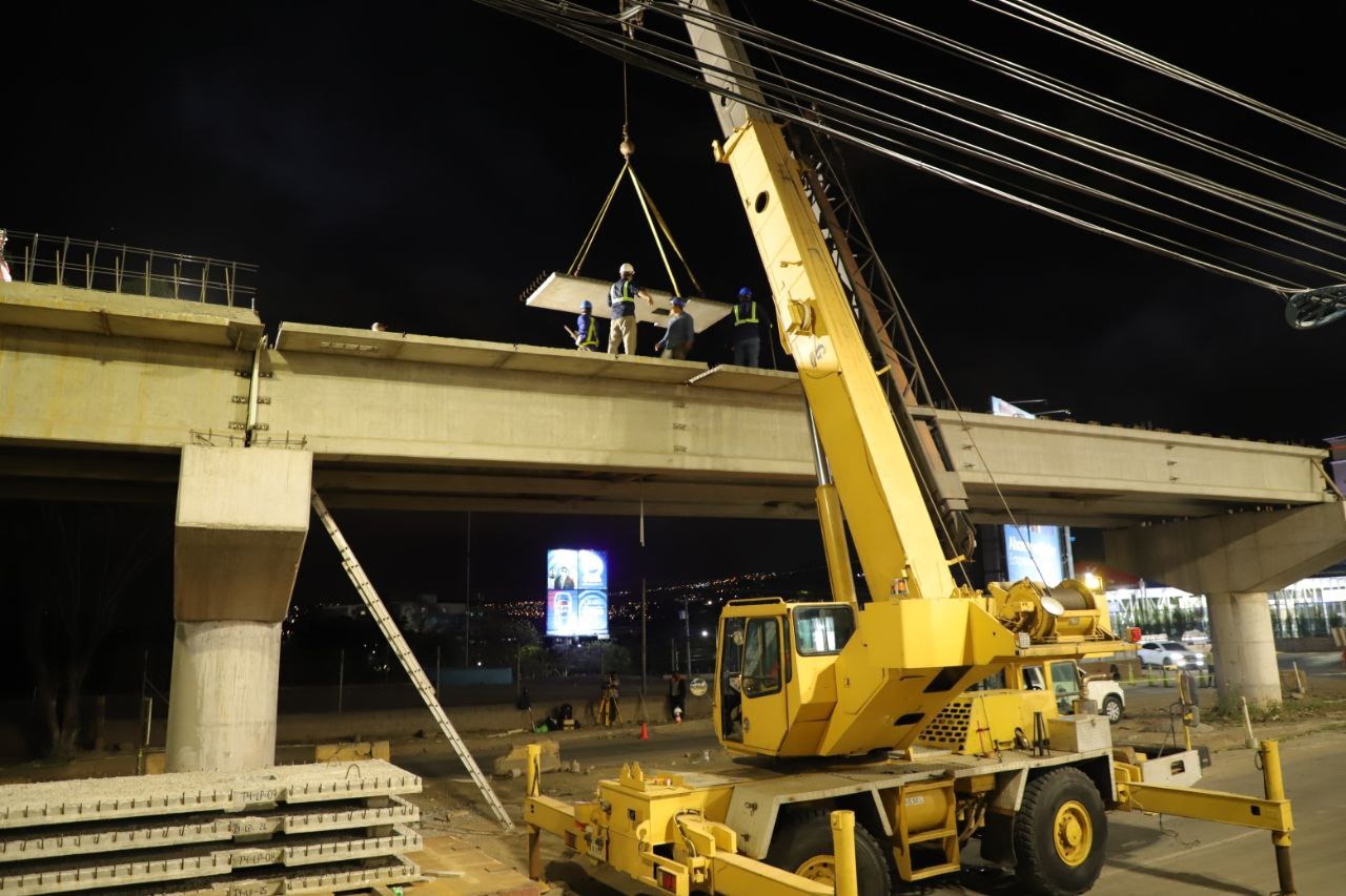 La construcción del paso a desnivel en el bulevar Juan Pablo II de la capital continúa con el montaje y la instalación de las prelosas, en intensas jornadas de trabajo que se realizan en horas de la noche y madrugada para no ocasionar
