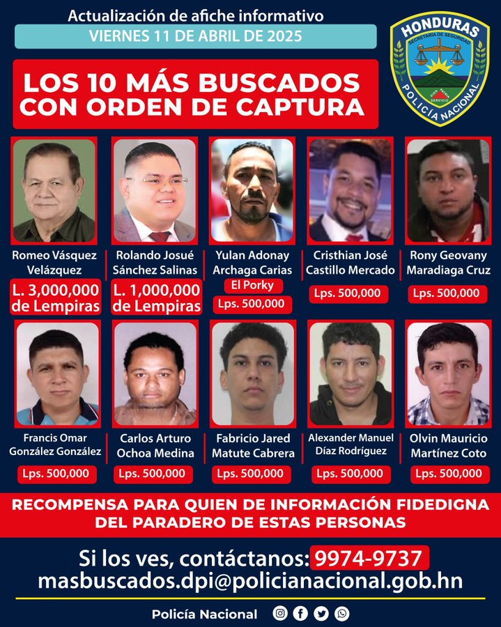 La recompensa por el paradero de Vásquez aumentó de dos millones a tres millones de lempiras. Inicialmente, cuando se dio a conocer la lista, la recompensa era de 500 mil lempiras y desde entonces ha ido aumentando.